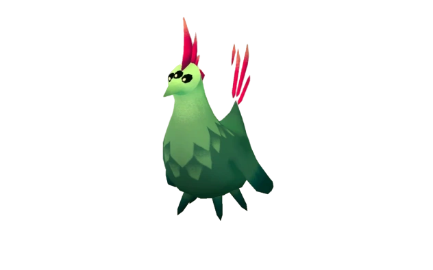 Pickens are small green three-eyed birds with bright crimson combs on both their head and tail. Their body is round and low to the ground, walking on four stubby legs, while also having a pair of small wings that flap occasionally. The majority of their color is a dark sea green, while their head and neck is a lighter shade of green. On each leg, there is a darker shade on the very tip of the nubs.